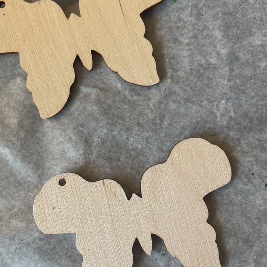 Approximately 3x2 in size, they are made out of wood, fabric, and hypoallergenic ear wires.