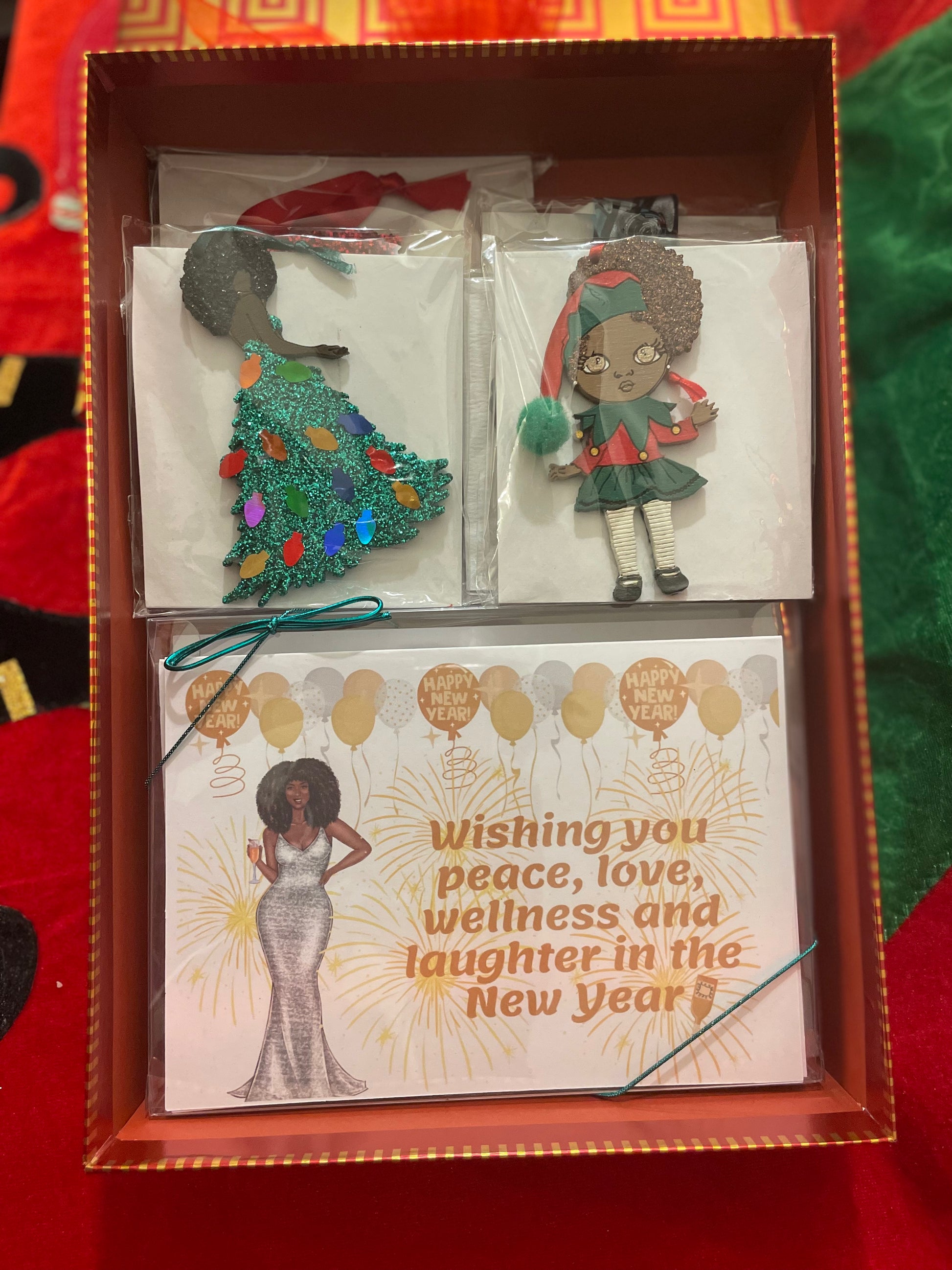 Let's put “US” in your Christmas decor this year. This Christmas ornament gift set comes with 8 handpainted Black Christmas wooden ornaments and 8 Assorted Black Christmas cards. Spread melanin cheer this holiday.