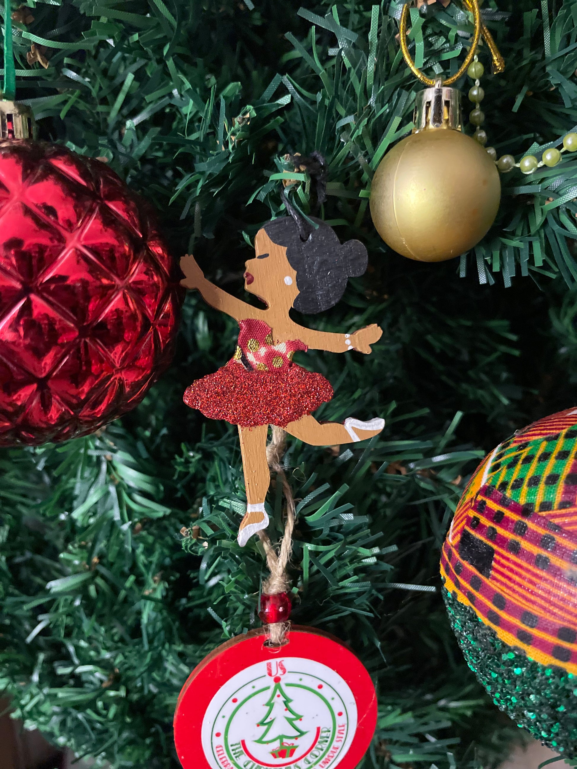 Welcome the holidays with a graceful spin - get your hands on our festive Christmas Ballerina! Whether you buy one, two, or the trifecta of Scarlet, Emerald or Golden ballerinas, each is adorned with a hand-painted, glitzy tutu and an African fabric-cut bodice. Get your twinkle toes party-ready with a little help from us! Measuring 3 inches each.